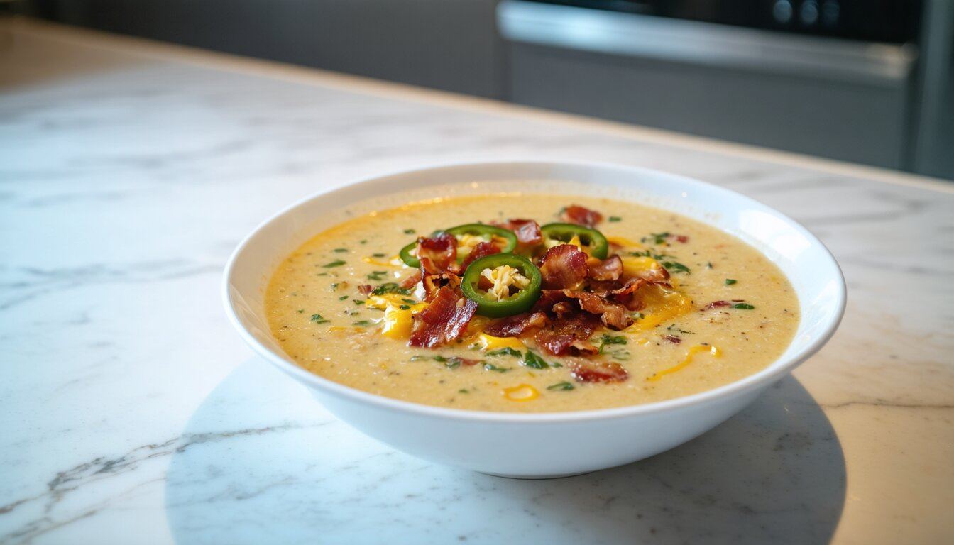 Creamy Beer Cheese Soup with Crispy Bacon and Spicy Jalapeños