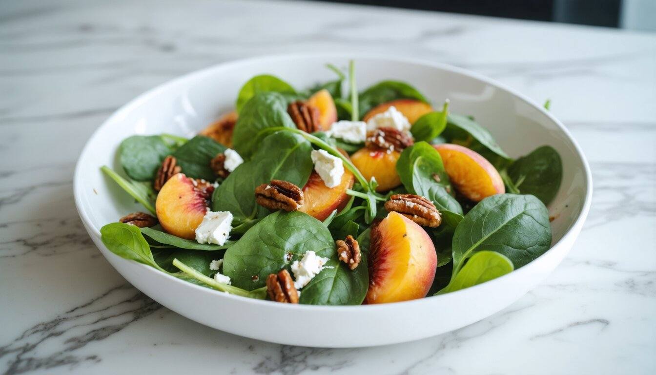 Peach, Basil, and Goat Cheese Spinach Salad with Candied Pecans