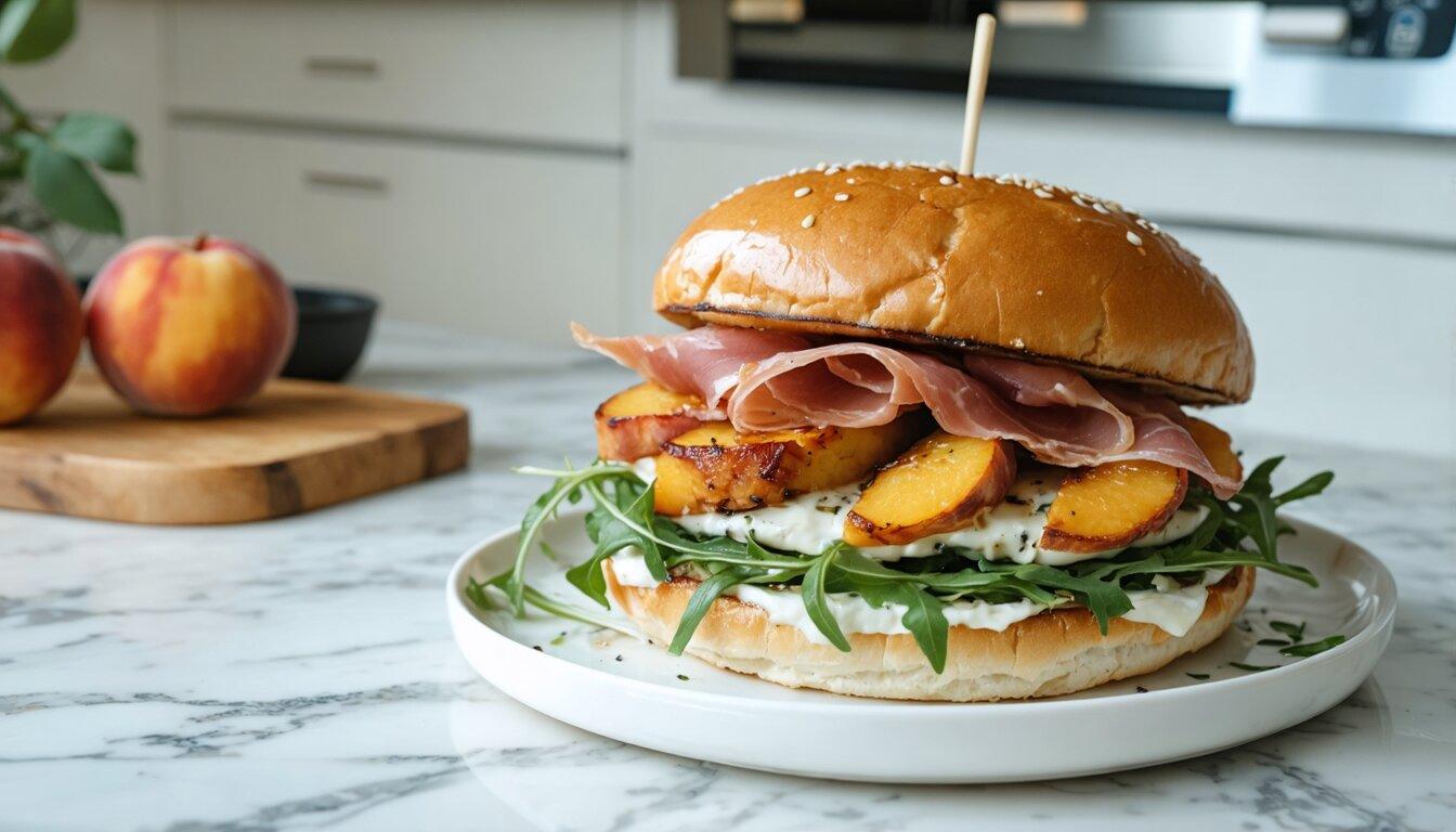 Peach and Prosciutto Brie Turkey Burger with Arugula
