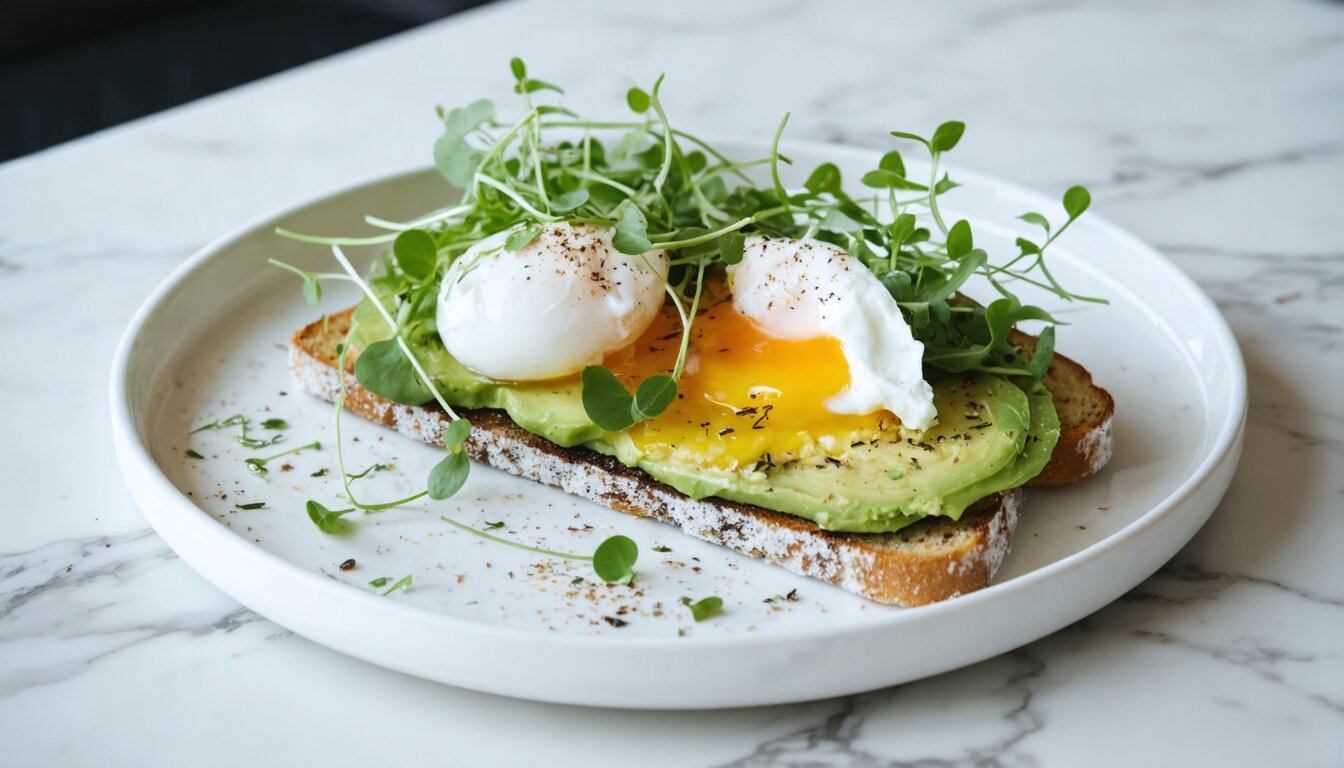 Avocado Challa Toast with Poached Eggs and Microgreens
