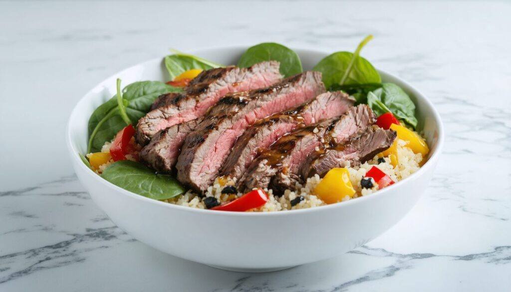 - Top each bowl with sliced steak, bell pepper, and fresh spinach.