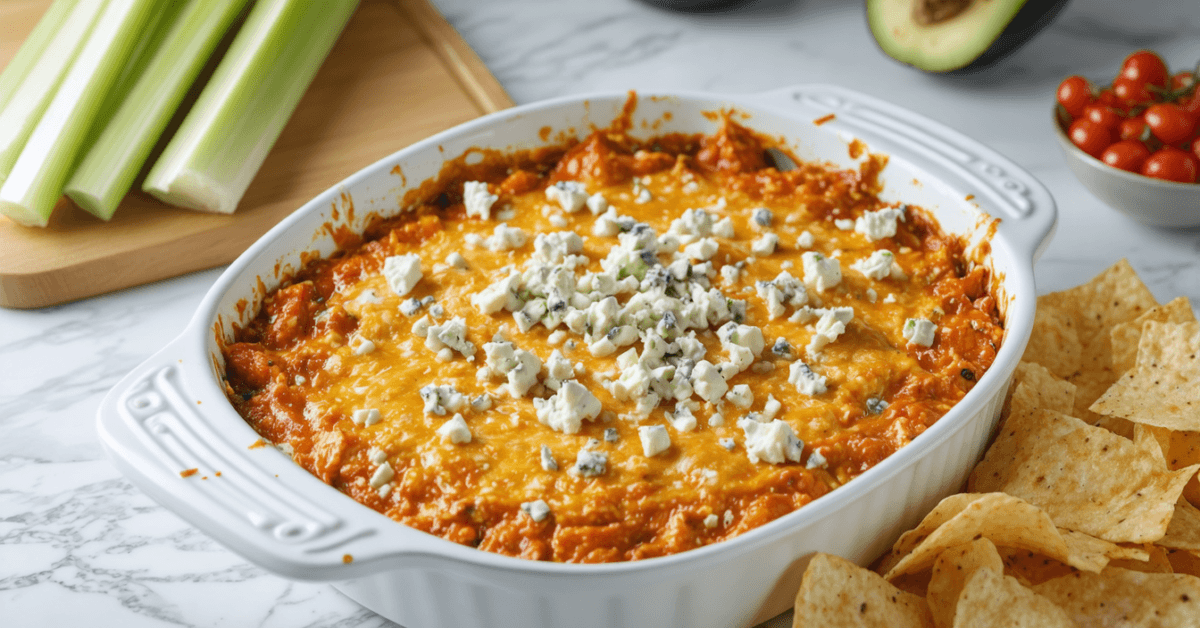Explore the rich flavors of Buffalo chicken dip with blue cheese crumbles, an appetizer that pairs creamy textures with bold, spicy tastes. This dip features shredded chicken enveloped in a mixture of cream cheese, buffalo sauce, ranch dressing, and blue cheese, topped off with extra blue cheese crumbles. Ideal for gatherings, it serves beautifully warm alongside tortilla chips, celery sticks, or crackers. Simple to prepare, this dip is bound to delight any who try it.