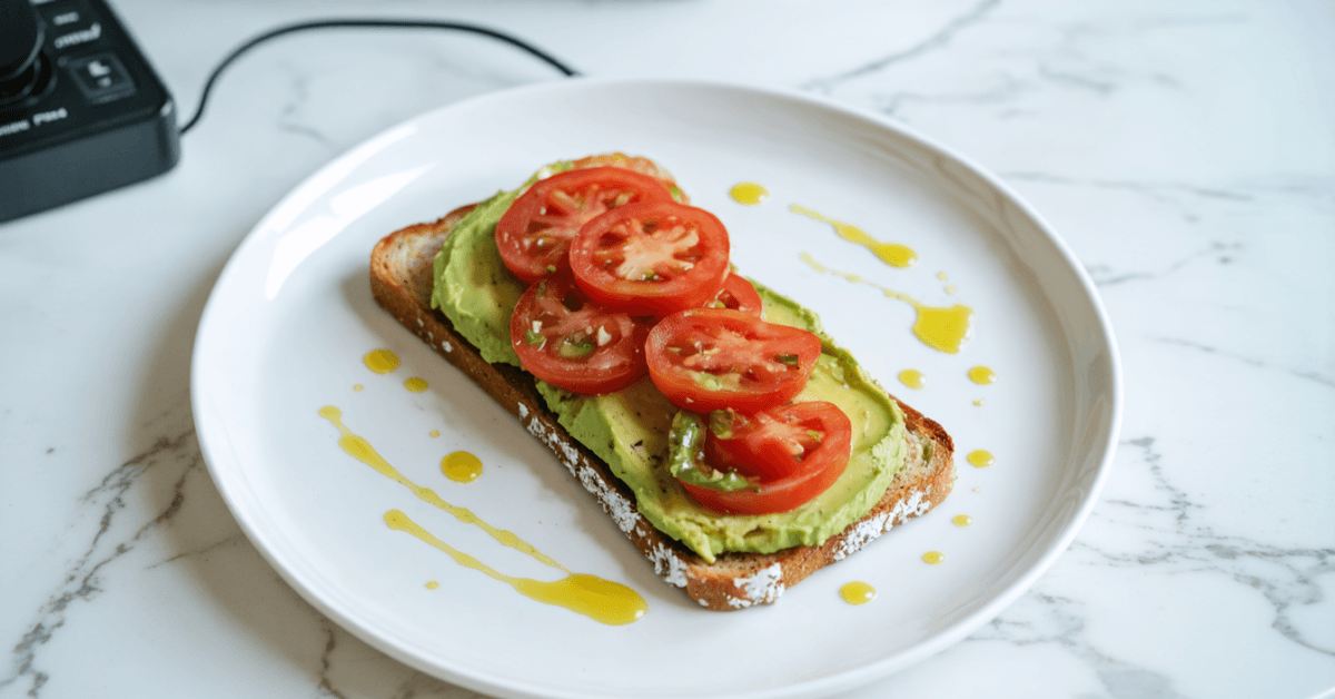 Enjoy a vibrant and wholesome dish with this avocado toast topped with tomato slices. This dish combines creamy mashed avocado with fresh, ripe tomato slices on toasted whole grain bread. The richness of the avocado pairs wonderfully with the sweetness of the tomatoes, enhanced by a light drizzle of olive oil. With its simple preparation and fresh ingredients, this dish is excellent for a nourishing breakfast or a light lunch. It requires minimal preparation time, making it suitable for quick meals without sacrificing taste or health benefits.