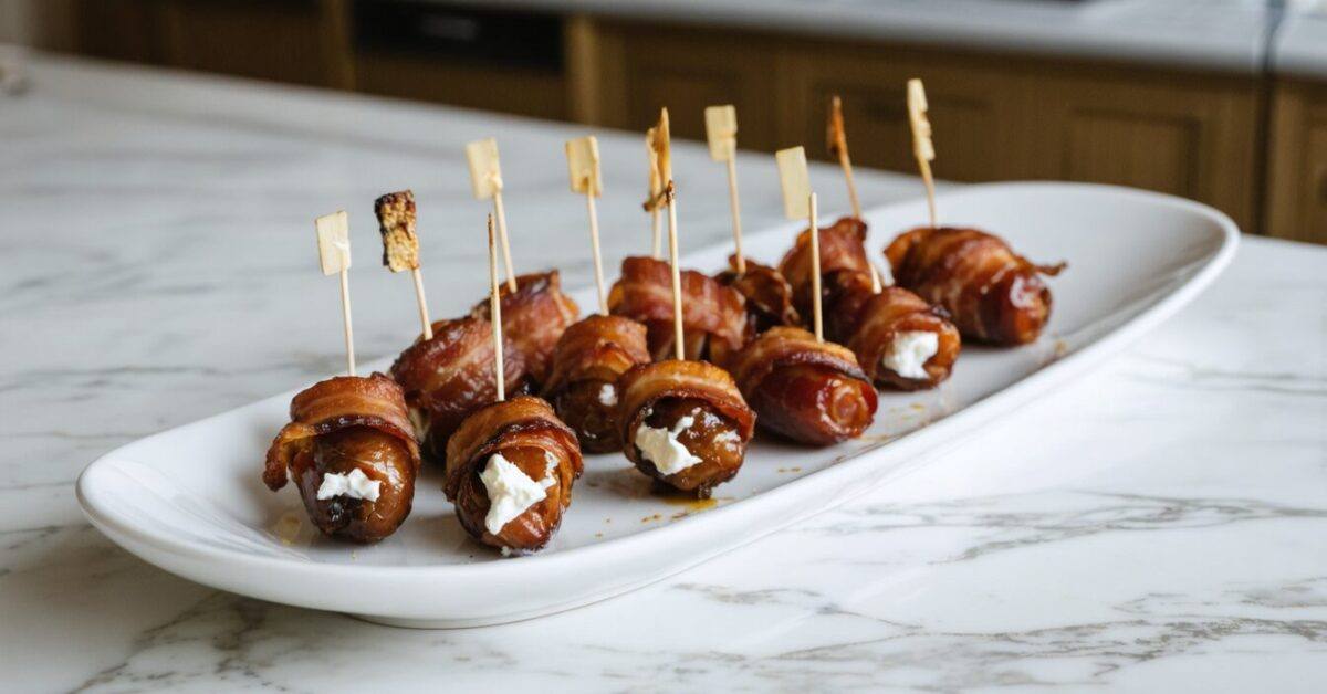 - Wrap each stuffed date with a half-slice of bacon and secure with a toothpick.