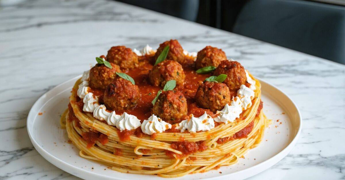 Transform your pasta night with this innovative baked pasta cake, complete with savory meatballs and a creamy ricotta frosting.