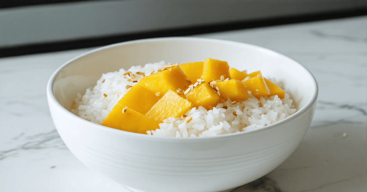 Explore a tropical morning treat with this Mango Sticky Rice Breakfast Bowl. The dish blends the creamy sweetness of coconut milk-infused sticky rice with the fresh tanginess of ripe mango slices, complemented by a crunch of toasted sesame seeds. It’s a delightful mix of flavors and textures that brings a slice of Thailand right to your breakfast table. Ideal for those in search of a unique breakfast or a tropical flavor any time of the day.