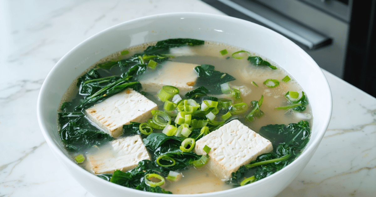 Savor the savory depths of Miso Soup with tofu and greens, an authentic Japanese dish both simple to prepare and rich in flavor. This warm, inviting soup marries the umami essence of miso with the silky texture of tofu and the fresh vibrancy of leafy greens. Ideal for those seeking a light yet nourishing meal, this soup delivers a delightful taste experience, appealing to the senses on cooler days.
