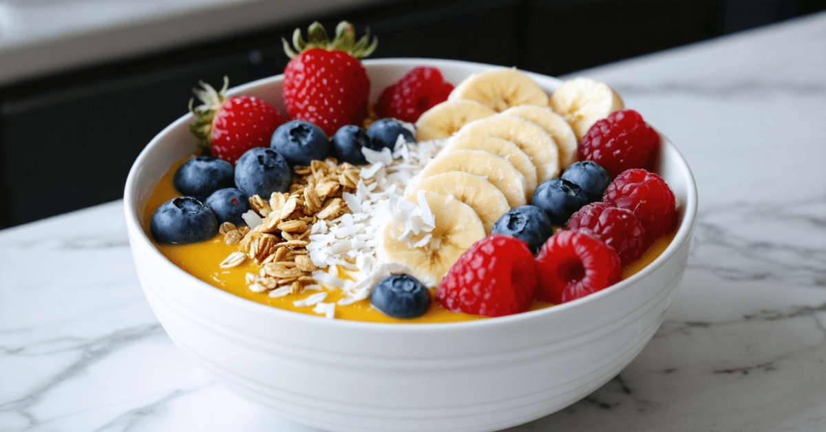 - Garnish with granola, fresh berries, sliced bananas, and shredded coconut.