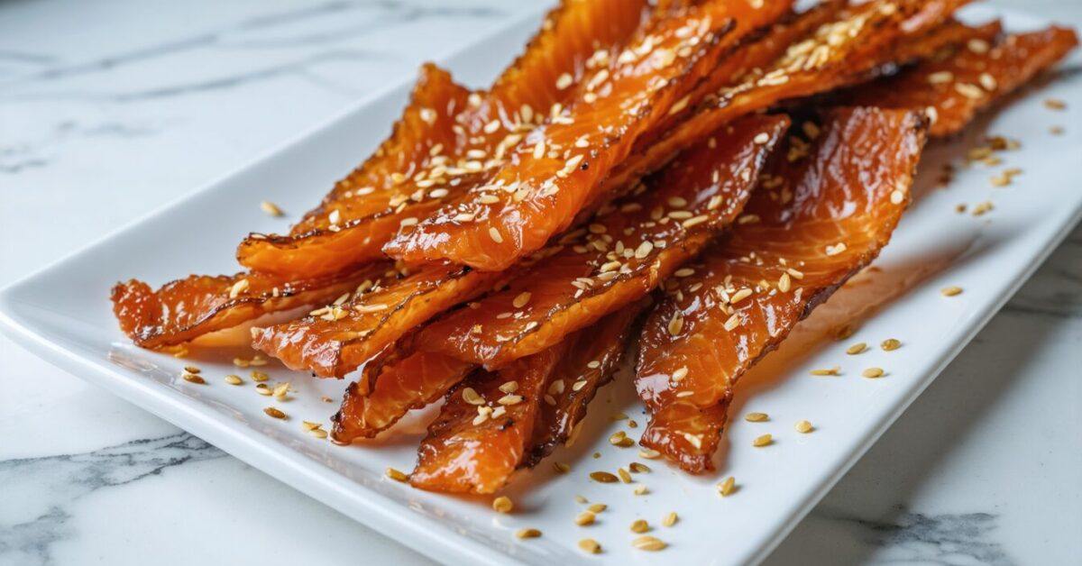 Sweet and savory candied salmon jerky with sesame seeds offers a delightful and healthy snack option.