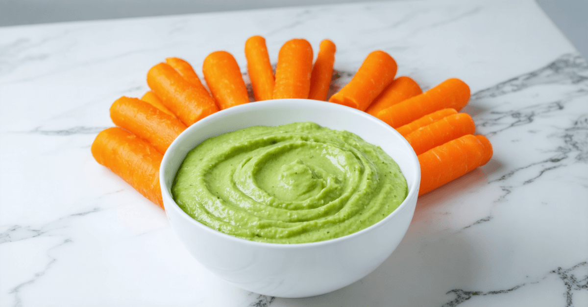- Arrange the carrot sticks on a platter and place the chilled avocado dip in the center for easy access.
