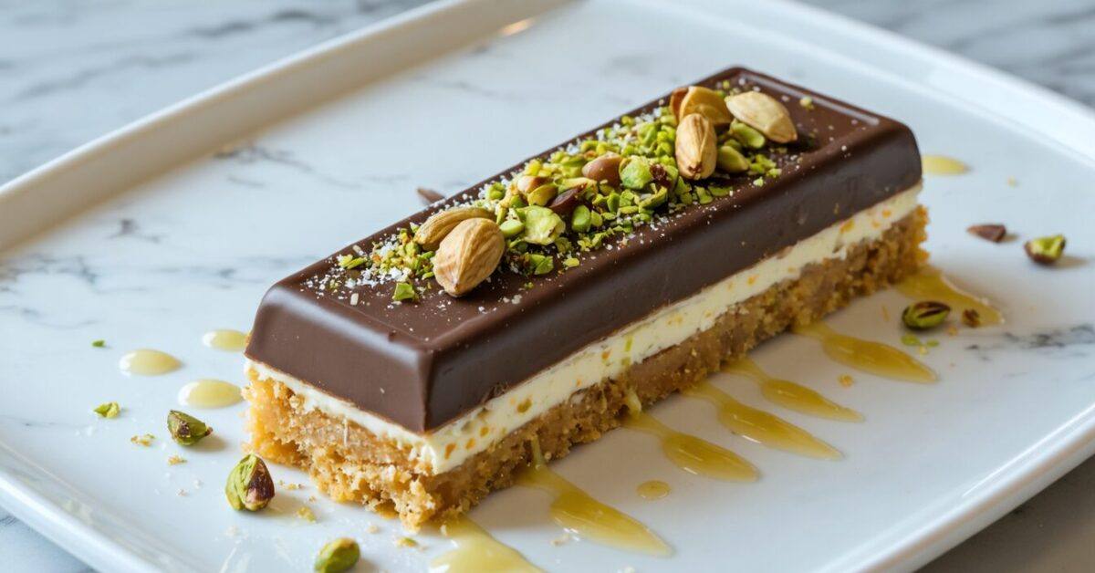 Discover a luxurious treat with this Dubai-inspired chocolate bar, featuring a unique blend of chopped kataifi, tahini halva, and pistachio cream.
