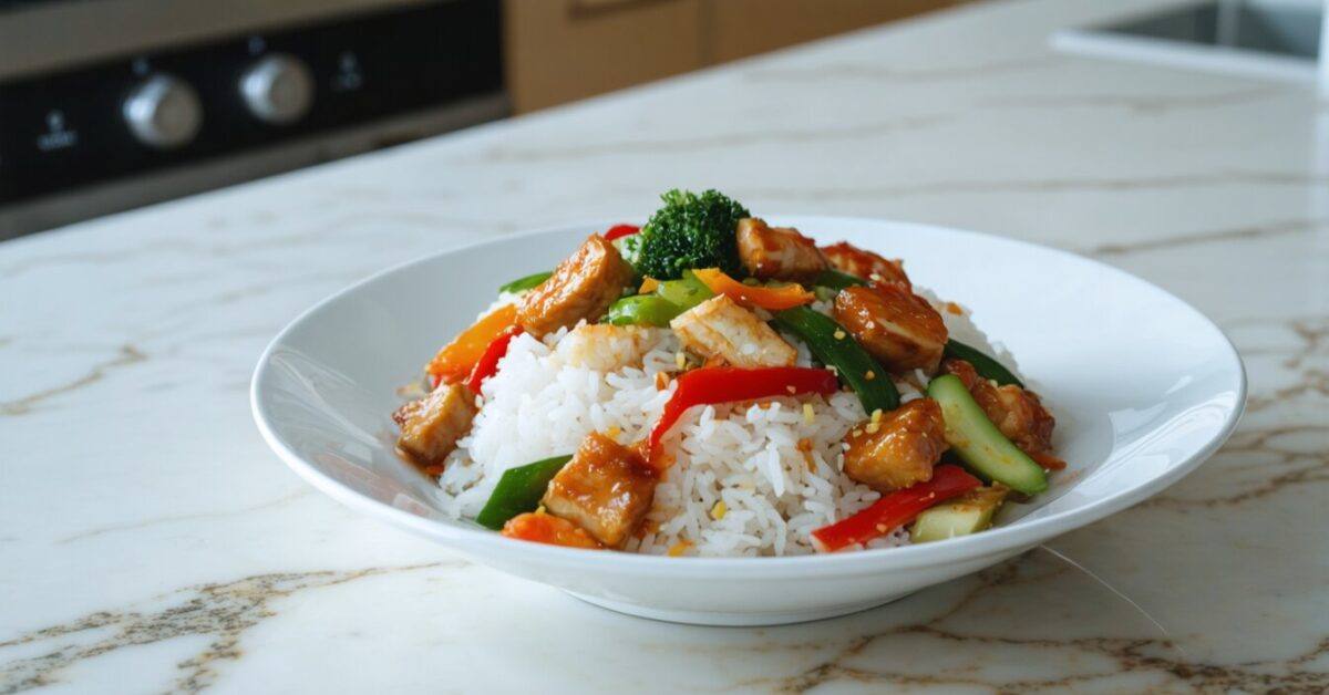 - Place the reheated dishes around the rice on the plate.