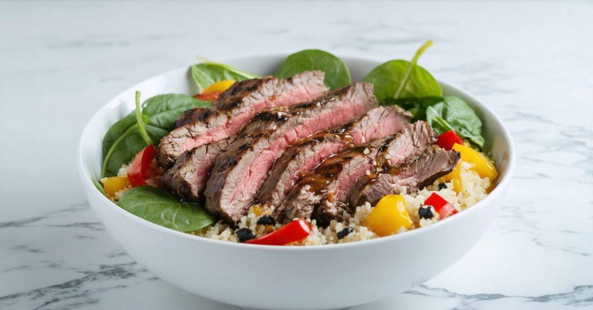 Craft a flavorful steak bowl with tender slices of steak, vibrant vegetables, and a hearty grain base.