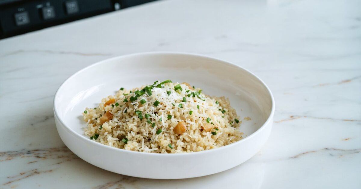 6. Transfer the fluffed quinoa to a mixing bowl. Stir in the cooked garlic, grated Parmesan cheese, salt, and black pepper until evenly combined.
