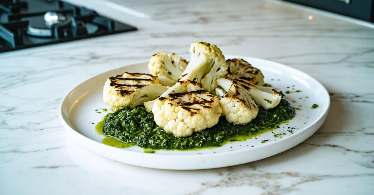 - Arrange the grilled cauliflower steaks on a serving dish and generously drizzle the prepared chimichurri sauce over the top.
