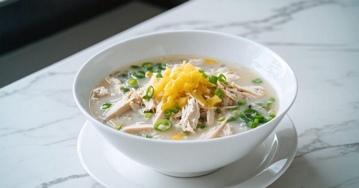 - Serve the porridge in bowls, topped with shredded chicken, green onions, and a drizzle of calamansi juice.