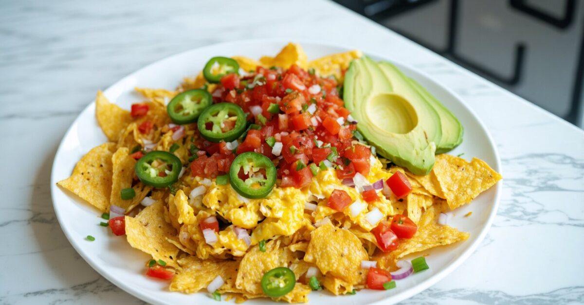 - Pour the egg mixture into the skillet, stirring gently to combine with the tortilla strips.