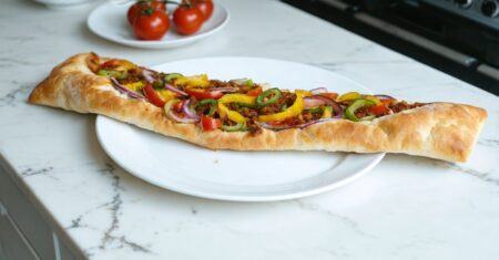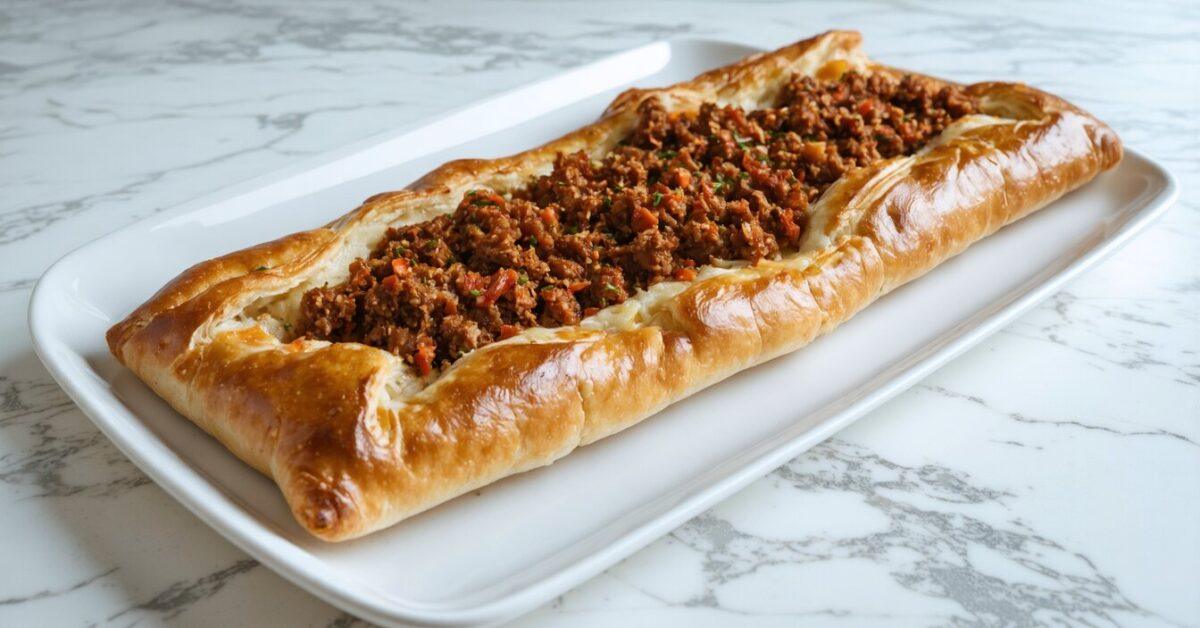 Pide with Minced Meat is a traditional Turkish flatbread known for its savory topping of minced meat, onions, tomatoes, and spices. The dough is soft and chewy, serving as an excellent base for the flavorful meat mixture. This recipe combines straightforward ingredients to create a tasty and fulfilling meal evocative of the vibrant culinary scene of Turkey. Whether served as a main dish or appetizer, Kıymalı Pide offers a rich taste experience that transports you to the bustling streets of Turkey with each bite.