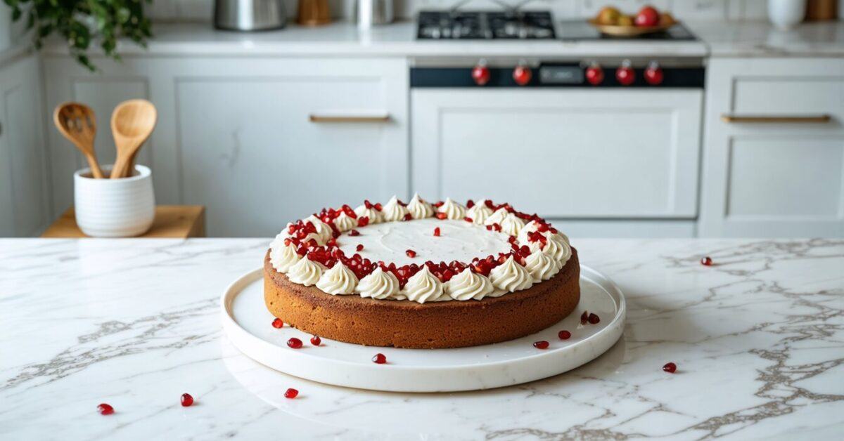 - Garnish with pomegranate arils, scattering them evenly over the frosting for a pop of color and flavor.