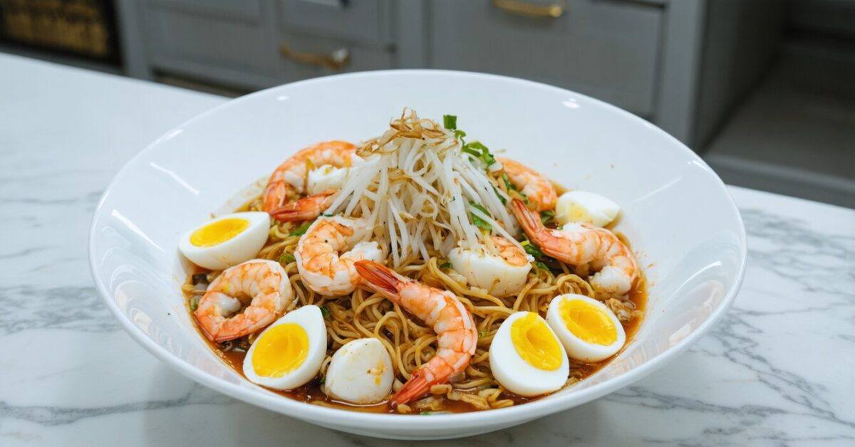 - To serve, divide cooked noodles into serving bowls, top with blanched prawns, bean sprouts, and halved hard-boiled eggs.