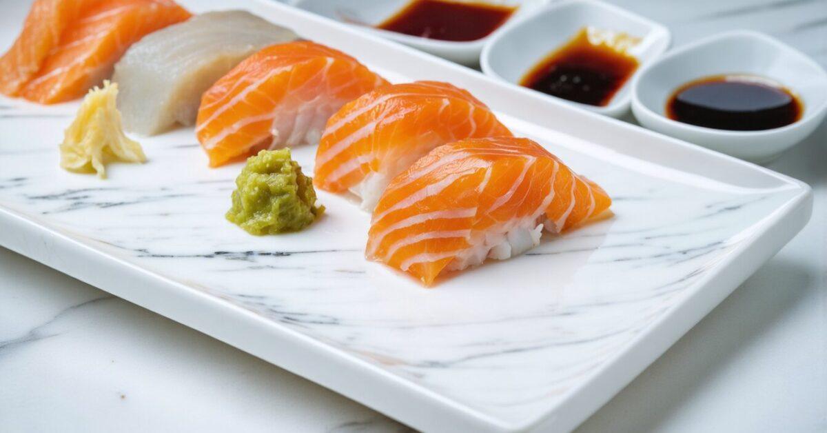 - In small separate dishes, serve soy sauce, wasabi paste, and pickled ginger on the side.