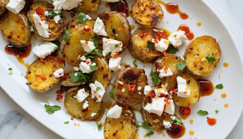 - Transfer the potatoes to a serving platter. Sprinkle crumbled feta cheese over the top.