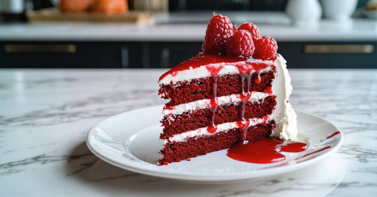 - Drizzle the remaining raspberry sauce over the cake, letting it drip down the sides for a bleeding effect. Serve and enjoy.