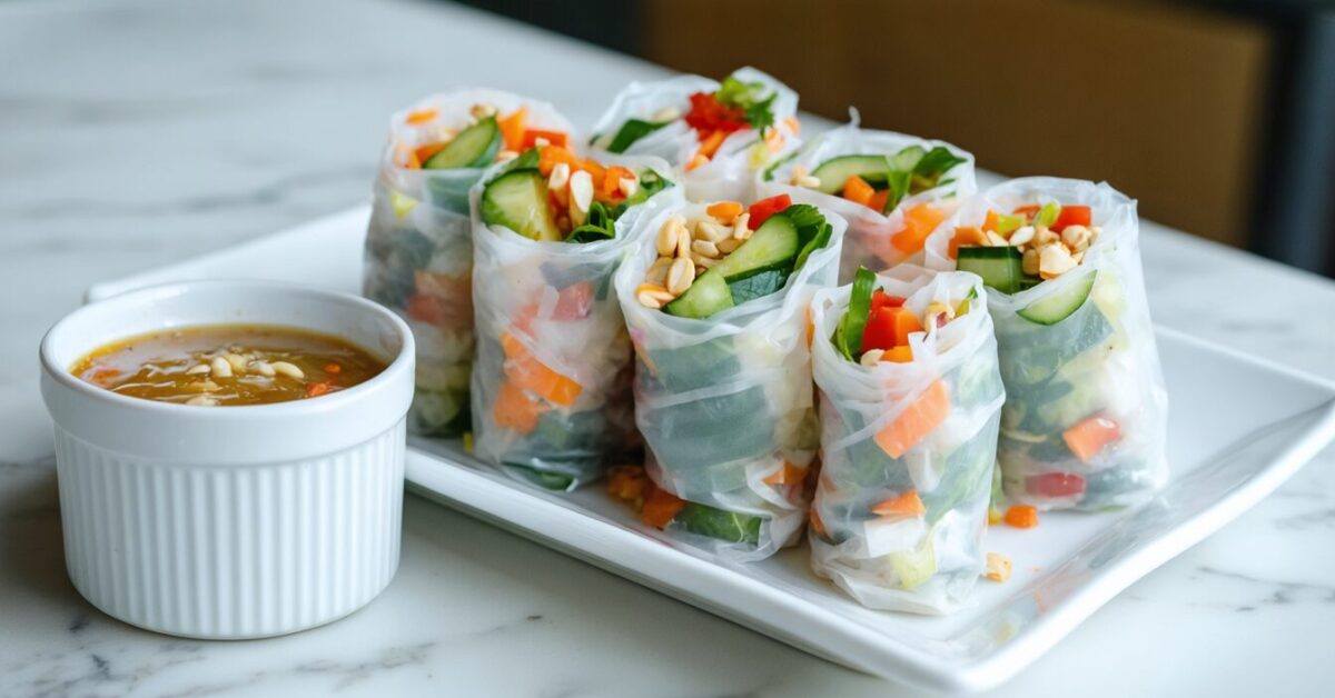 Enjoy fresh and crunchy vegetable spring rolls paired with a savory peanut dipping sauce for a delightful appetizer.
