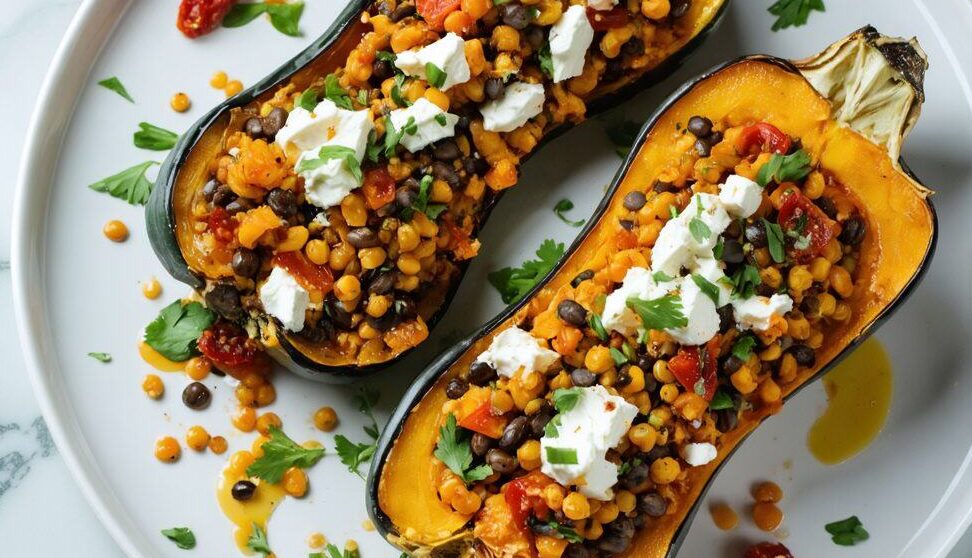 Mediterranean Feta and Lentil Stuffed Butternut Squash