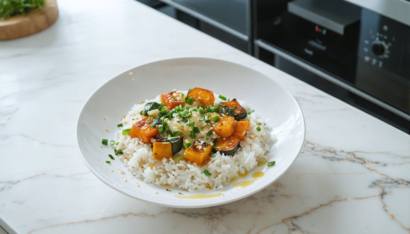 Roasted Veggie Vegan Rice Bowl with Garlic Sauce